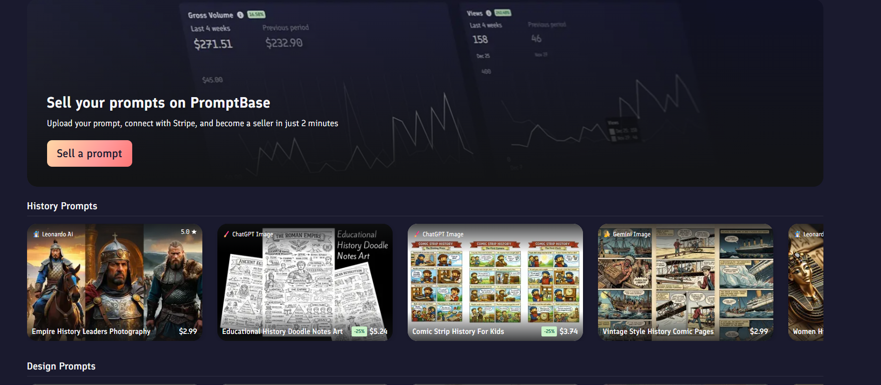 أسهل طريقة وأكثرها شيوعاً. تقوم بإنشاء Prompt مميز، تضع له سعراً يتراوح غالباً بين $1.99 و$9.99، وفي كل مرة يشتريه أحد تحصل على نسبة من البيع. الموقع يأخذ عمولة تبلغ حوالي 20% ويصلك الباقي مباشرة عبر Stripe.